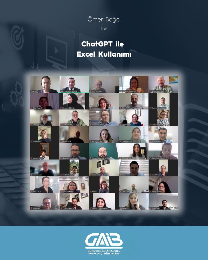 Güneydoğu Anadolu İhracatçı Birlikleri (GAİB) iş birliğiyle düzenlediğimiz “Yapay Zekâ ile İleri Excel Eğitimi”, büyük bir ilgiyle başarıyla tamamlandı. Tek günlük, yoğunlaştırılmış bu eğitim, 3 saatlik programıyla 400’den fazla katılımcıya ulaştı.